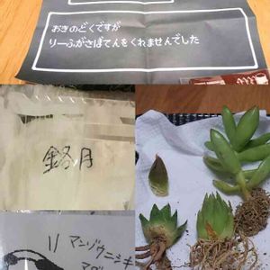 帰宅すると、リビングに怪しい茶色の包みが届いていた。 kj からだ。 彼のことだ。きっとまた何か企んでいるに違いない。 恐る恐る包みを開いていく。 ((((;゜Д゜))) 新聞紙に厳重に包まれている、やはり怪しい代物か(゜ロ゜;ノ)ノ 出てきたものは…。 アロエ翡翠殿…トゲトゲのなんてカッコいいフォルムだ😆 姫麒麟…姫という言葉に合わず、暴れている😆 そしてハオ…草玉露とツルギダ の子株😆 ここまでは、注文通りだった。 やはり一筋縄ではいかない男…kj 。 まさかの告発文だった。 タロウ社長…どういうことなのか、説明してもらいたい(笑)