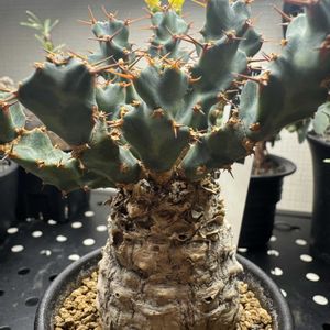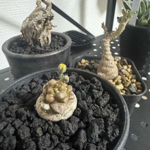 ユーフォルビア クラビゲラ 現地球① 手乗りサイズ‼️ Euphorbia clavigera‼️ 南アフリカが原産の塊根植物になります。 ゴツゴツとした塊根部から刺の生えた緑色の多肉質な太い幹を出し、 サボテンと塊根植物の要素を感じれるとても希少な植物になります。 そんな見た目の厳ついクラビゲラから黄色い花が咲きて来ました😳 なんかみずみずしいお花です🌼 どこまで大きくなるか楽しみです。 またアップします⤴️