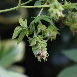 ◆カナムグラ(鉄葎)◆ アサ科のつる性1年草 花期は8〜10月 日本全土の道ばたや荒れ地などに生える。茎や葉柄には下向きの刺。葉は対生、掌状に5〜7裂。雌雄異株。雄花は淡緑色。雌花は苞に包まれ、下向きの短い球穂状花状につく。雌花の苞ははじめ緑色で濃紫色の斑紋があるが、花のあと大きくなり、果期には全体が紫褐色を帯びて先がそり返る。果実はそう果。 (2021.12.6 追記) nikoさんに雌花だと教えていただきました。 2021.11.20 都立水元公園にて📷