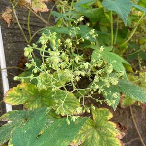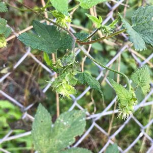 カナムグラ(鉄葎) 在来種 アサ科カラハナソウ属 花期8-10月 つる性で雌雄異株。 左→雄花 右上→雌花 日本全土に生育する雑草で、繁殖力が強く道端や荒地など、どこにでも生え、広がる。 ⚠️花粉症の原因になるので注意