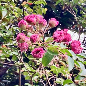 こんばんは♪ すっかり夕暮れ時が早くなり 秋だなぁ🍂 ①②八重咲き百日紅が まだきれいに咲いてました💕 ③④⑤散歩道にカナムグラなる つる草が 茂ってます。 小さな花が沢山付いてる 調べたら 雄株 雌株が有る ようですけど…⁈