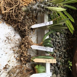 鶴仙園さんで購入した多肉と後藤サボテンさんで購入した多肉(ラメリー)とカクトロコさんで購入した多肉(シンメトリカ)の植替えしました。 根っこの様子ですが、サボテンと異なり、根の先端がやや丸みを帯びている気がします。一応どの株も根に痛みが無く、新根か出ていましたので、自然に落ちる土と根だけ落とし、即植付け。 紅彩閣の根を乾かして失敗したばかりだったので… 左から、 パキポディウム・ラメリー((Pachypodium lamerei) パキポディウム・ロスラーツム(P. rosulatum) 九頭竜(Euphorbia inermis) 黄棘紅彩閣(E. enopla var. 'Yellow spina') 仔吹きシンメトリカ(Euphorbia symmetrica f. monstruosus) です。(学名あってるかな??)