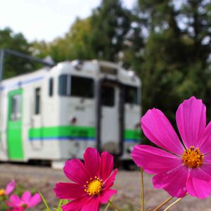 北海道新十津川駅で撮影。 利用者が少なく、今では始発が終電(1日一本のみ)の新十津川駅。 当時カメラの趣味を始めたばかりで写真はこれしか残っていませんでしたが、駅前にはコスモス畑が広がっています。 汽車が到着すると、咲き誇るコスモスとともに近所の保育園の子供たちがお見送りをしてくれました。 そんな思い出の一枚。