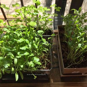 パクチー、キッチンの窓辺ではこのくらいが限界かなぁ…間引きしてみたけど、カイワレ状態 種まきから35日です。