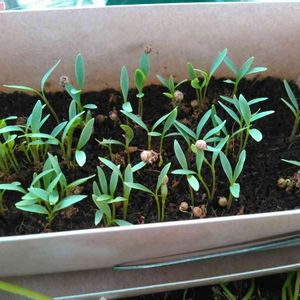こちらは同じ日に種まきをし、ずっと軒下に置いていたものです。芽が出るのは遅かったですが、しっかりとした茎が育っているようです。 容器はスーパーの二個入りケーキのパックです。 このあと間引きました。