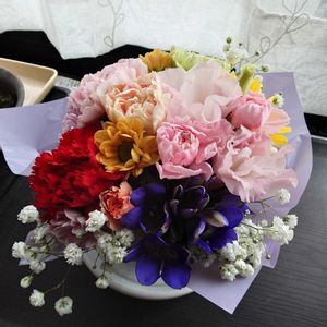 花束をいただきました💐 夫の納車記念だそうで😅 普段からお花をいただくことなんてないので 嬉しくなって撮影してみました📸 前と後ろで印象が違う👀✨ 育てるお花ばかり見ているので、華やかなお花たちが詰まっていて楽しい🎶