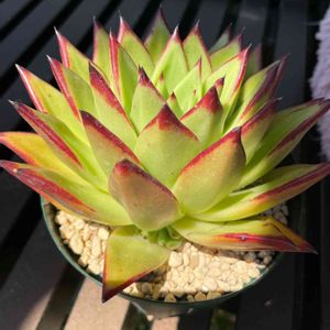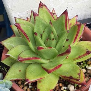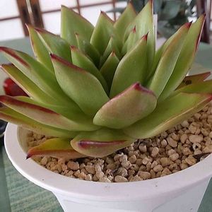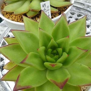 真ん中、 オウンスロー。 上から時計回りに、 アイリッシュミント。 ピンクシャンペーン。 魅惑の宵。 シャルモン。 ラウリンゼ×魅惑の宵。 モルゲイン×メキシカンG。 大きくなって窓辺では窮屈そうだったエケベリアたちを一鉢にまとめて玄関へ。