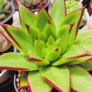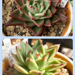 エケベリア アガボイデス コンテペック、魅惑の宵 青々。 コンテペック(左)は16cm。 横から見るとほんとにアガべっぽいです(アガボイデス)👍 魅惑の宵(右)は10cm, エッジが赤くて葉数も多い。 綺麗な色や爪やエッジやフリルや粉や、小さいものや大きいもの… エケベリアも底なし沼か。