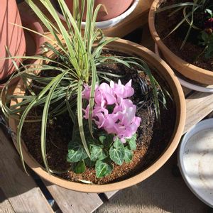 同じく緑の細長い葉っぱにピンクのガーデンシクラメン植えました。
