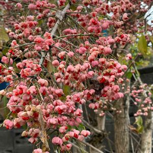 真弓 マユミ🌿💗 弾ける前のマユミの実 コーラルピンク色のキャンディがぶら下がってるみたいです かわいい😍