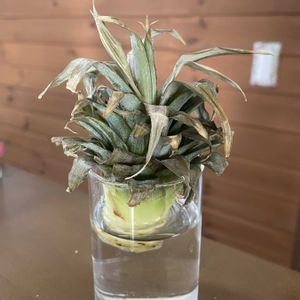 パイナップル水耕栽培 昨日パイナップルを切っていて、知人が水耕栽培できたよと言っていたのを思い出したので始めてみました。