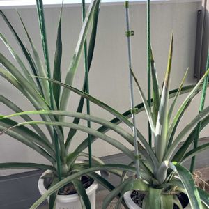 🍍パイナップル成長記録🍍 ベランダに出してから1カ月半くらい。 あまり成長している感じはないが、 葉っぱの広がりがものすごい。 どうにもならないので、 軽くヒモでまとめてみた。 成長に悪影響にならないことを祈りつつ…🙏