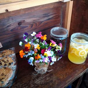 良くコーヒーのみに行くお店にカットしたビオラ 飾って頂きました! はやりの件で今は持ち帰りが多いです😓 お花があるだけで少しでも癒されたらいいかなぁ?と思いました🥰