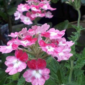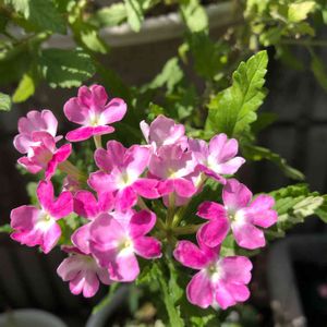 宿根バーベナ「ピンクパフェ」 本来は上画像のようなお花なのですが。 大雨が過ぎて急に猛暑が続き、株元の葉が枯れて花をつけなくなったので、日陰に移してのびた枝をピンチし挿したところ、暑さに負けず花芽が上がったまでは良いけれど、ピンクパフェと言うよりピンクピンクなお花が咲きました。 これはこれで可愛いんですが(^_^;)