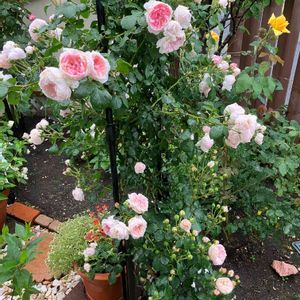 うちのまだ緑緑しいバラちゃんの一部を記録。 【1枚目】今年は早くから株元のシュートがすごいんです。おそらく肥料を変えたから😁 毎年、有機肥料を自分で配合していましたが、今年はコストも考えて京成バラ園の有機50%化成50%の配合肥料にしてみました。さすが化成肥料配合、ガツンと効いてる手応えがあります。京成バラ園の配合肥料は地植え用と鉢植え用があり、どちらも使用してみてます。 化成肥料の弊害は虫害が増えることですが、どのくらい違うのかな? あと、化成がガツンと効くから近くに宿根草を植えたら最悪枯れるらしいので、今年は肥料を混ぜ込んだ場所には何も植えず、鉢置きで対応してみてます。 【2枚目】斜めに誘引されているのは小ぶりな一重咲きのモーツァルト、奥に見えるのは、母が今年がんばって作っていた棚もどきで、ピエール・ドゥ・ロンサールが絡んでます。うまく咲いてくれるのかな?🤔 【3枚目】庭の中心にはモンスターと名高いポールズヒマラヤンムスク。いったい何がどうなっているのかもうわかりません😂 もちろん真ん中のポールにも、その右横のオベリスクにも収まらず、どこまで続いているのやら?💦 左端に見えるのはつるバラ・アンジェラのアーチですが、こちらもアーチに収まってないので今年はどんな形になるのやら?😅 【4枚目】今年いちばん成長しているのはERのグラハム・トーマス。表に向かってたくさん蕾を持っています。 【5枚目】それだけに留まらず、横にもこんなに欲張り誘引してました。昨季に枝がよく伸びたんでしょうね。どれだけ咲くのかとってもたのしみです🥰💕 おそらくゴールデンウィーク前からチラホラ咲き出すんでしょうね。待ちに待ったバラのシーズンまで、あともう少しです😍💕