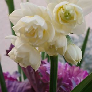 *水仙* 球根をもらい去年から育てています。どんな花が咲くのか楽しみにしていました。名前はわかりませんが、八重で小さめのお花が咲きました💕かわいい〜