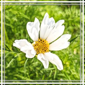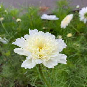 コスモス・ダブルクリックスノーパフが満開です😊 白い花ビラに、陽が当たって文字通り輝いてます。 とってもキレイ(*^◯^*) 本当はここに、チューリップの球根を植える予定でしたけど、これを見せられるとねぇ。 冬が来るまで楽しむことにしました。
