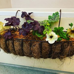 ペチュニアのハンギングバスケット🌿 ヒューケラが思い描いたシルエットにならず💦 ヒューケラを抜いて、コリウスを挿しました✨