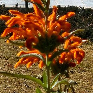 【カエンキセワタ(火炎着せ綿、レオノティス、ライオンズイヤー、クリスマスキャンドルスティック)】 南アフリカ原産、シソ科常緑小低木 茎の上部に輪散花序を出し、長さ7~8cmで橙色~橙赤色の唇形花を茎を取り囲むように輪状に咲かせる。 「火炎」の意味は、花の色と形が炎のように見えることから。なお、学名や別名は「ライオンの耳」という意味。 草丈:0.6~2m 開花時期:10 月~ 12 月 花色:橙色、白色 近所の駐車場
