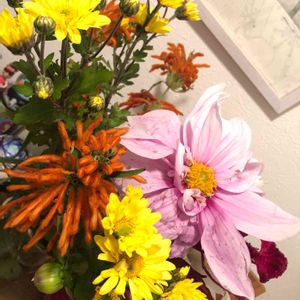 ピンクのは崩れてるけどダリアでしょう。オレンジ色のは何かしら?