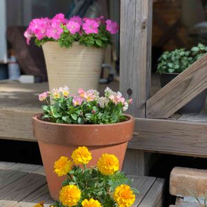 職場の園芸担当になりました~ 花壇の植え替えと鉢花を♪ アザレアは白、薄ピンク、濃いピンク。 定番コスモスに珍しくブーゲンビリアも。ブーゲンビリアの花は、中にもうひとつ白い花があるんですね~(違ってたらゴメンなさい) 真ん中のは、もりもり元気なインパチェンス!!