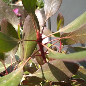 プロテアに蕾か葉芽か分からない新芽が。他の果樹にも蕾がついてきています。