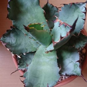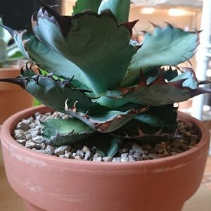 アガベ記録写真 2018/1/3撮影 ウチのアガベ番号7番 「チタノタ ブルーボール」さん♪ 写真のセンスゼロ。。orz この写真の100倍格好イイ子なのですが…、 ブルーボールさんゴメン(>_<)ノ でも確かに育成に悩みが…、 株元に小さな子株が居るのですが、 その子が大きくならない! 水少な目で絞めて育てたいのに、 ついつい甘く育てがち…、 ブルーボールは絞めて育てなくても、 綺麗なフォルムに育ちそうだし、 水沢山あげて葉を大きくした方が良いような…、 でも軟弱な子に育って欲しくないし…、 あっ! 成長は絶好調で早い早い! 3ヶ月で5枚葉が開く感じ♪ アガベ好きでもあまり知られていない話かもですが、 この子もホリダの遺伝子が多少入っている、 厳密には「チタノタ」ではなく、 「チタノタ交配種」 まぁ「チタノタ」の原種が数少なく、 「チタノタ」と云う品種名には、 交配種って意味を内包してる感じですけどね(^-^; 「松ぼっくり」形に育つナンバーワンを代表とするチタノタですが、 ヨーロッパなどで人気の弾丸形に育てるのには、 ホリダの遺伝子が強い チタノタFO-076が最適ですが、 次に弾丸形に育てるのに適した品種が、 このブルーボールだと思います。 弾丸形…、 そんなフォルムに育つのがホリダの遺伝子のなせる技だと…、 目指せ!美しい弾丸アガベ!(*^.^*)
