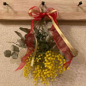 少しずつミモザも咲いてきました✨ まだまだ蕾の方が多いです💛 ぽわぽわさんを集めて、去年友達に分けてもらったユーカリのドライと合わせて、スワッグもどき😆🌿 先日の次女お誕生日会が今夜に延期になったので(食べて飲むだけなんだが🍻🤣)、娘にあげるんだ💛🌿💖