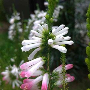 「エリカ・ホワイトデライト」 の花がまた 咲き始めてきました✨ 四季咲き性なので一年中 楽しめます👌 夏の高温にも強いようです 育てて2~3年目ぐらいになりますが徒長し続けてくれるのはいいのですが全体的に整ってません😅 どこをどうしたら?といった感じです これから冬に向け温度が低くなると花の色もピンク色に変わっていくのでスポットライト🔦の様で綺麗です✨😊