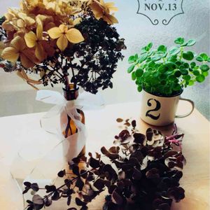 お花や植物に新芽が出て増える気配なのでポットの入れ替えしました。 あまりポット増やしたくないので、何とか詰め替えしています。 こういう作業もほぼ素人の私にとっては楽しいなーと思います😊 ↖️は古株のカランコエと挿し芽をして増やしたものを両サイドに並べました。 真ん中は多肉ちゃんを大人とベビー作成ルームに分けました 一本から枝分かれした物 ↘️はドライのあまり物鉢