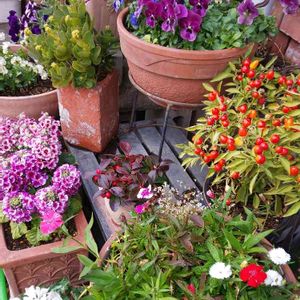 お花💠咲く☕️喫茶店前 別角度からの撮影🌼 観賞用🌶️トウガラシや ビオラ、ナデシコ など 黄色と緑色の植物の名前を 『 カランコエ 』と 赤い実と赤紫色の葉の植物の 名前を『 チェッカーベリー 』と ちゃむさんに教えて頂きました 。 有難うございました🙇 1月12日 11時 8分