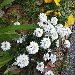 白い花の名前を がじゅまる子さんに 『 イベリス 』と教えて頂きました🤗 有難うございました😆 Iberis sempervirens でしょうか❔ センペルビレンス❔ キャンディタフト と言う 別名も有るようです😂 アブラナ科 マガリバナ属 ( イベリス属 ) 14日 11時 0分 名古屋市天白区内にて撮影 💠