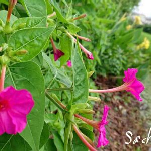 皆様、今日も1日おつかれさまでした😉 きのうのpicです❇️❇️❇️ 散歩道の小学校と水田の境に咲く「オシロイバナ」と「カンナ」稲も青々としてきました。みどりのまとめ「稲の成長と雑草、生き物」を見ていただき、 ありがとうございます😉🎶💖
