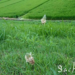畦道に生えてる、面白い形の雑草… やっと名前がわかりました👍 「ホソバツルノゲイトウ」 青々と伸びた「イネ」と 大好きな「ヤマザクラ」の木と 競演❇️❇️❇️
