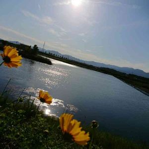 今日の川辺 鮮やかな黄色の花、何だろうと思いパチリ📷 川面が輝いて、美しいpicが撮れました🎉✨🎉✨ お花は「オオキンケイギク」だと思うんですが… 問題のある花みたい… こんなに綺麗なのに…