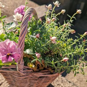 フリフリパンジーとリキマシアの寄植えを半額SALEで買いましたした。 バスケット🧺よりお安く買えたので、お得🉐😊 一度解体して花かんざしを追加して 寄せ直ししたら、いい感じ( *ˊᵕˋ)ɢᵒᵒᵈ