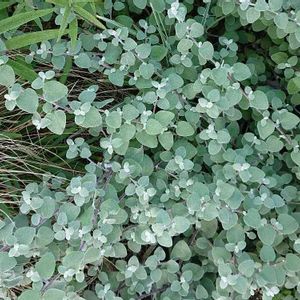 ヘリクリサム・ペティオラレ。 倒した鉢からこぼれるように広がる 生育旺盛なシルバーリーフ。
