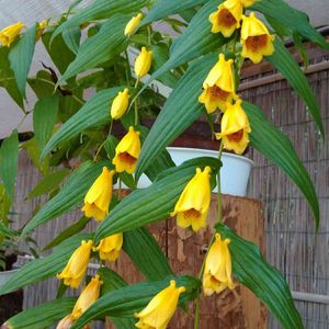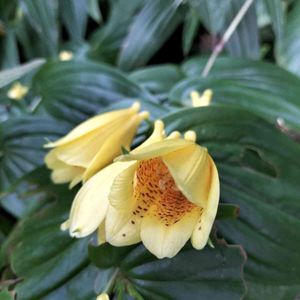 ユリ科ホトトギス属の💛キイジョウロウホトトギス💛と言うお花が咲いていました🥰💕 弓なりに伸びて垂れ下がる茎に、釣り鐘形で明るい黄色の長さ5cmほどの花が咲き、内側に赤紫色の斑点か多数あります✋