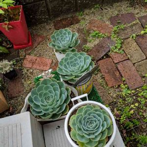 雨上がりはレンガの色がきれい😊 白い鉢の七福神はぐるっと子株がついてます😊 群生目指して子株も外さず♪ 蒸れないように気をつけなきゃ!!