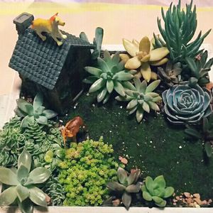 日本フラワーガーデンショウにて作った多肉の箱庭🎵 娘たちが頑張って作ってくれました✨まさかの七福神が入ってて興奮してしまった… 犬がなぜか屋根の上でお供が鹿w子どもの感性って面白い( ´ー`)