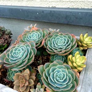 色違いのブリキに多肉のモリモリ寄せ💕 我が家のグリーンいっぱいのベランダに馴染む多肉の寄せ植えをイメージして作りました(*^^*) 多肉らしさとグリーンとの相性バッチリの大好きな2つです(*^^*) コンテスト用に投稿します^_−☆