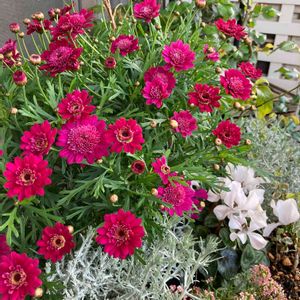 ボンザマーガレットがどんどん咲いてきました まだまだ蕾が控えています どんだけ咲くのよ!スゴイわ 花もちも良くて優秀やね 寄せ植えのシクラメンがのみ込まれそうです