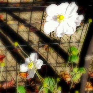学校のグラウンドと歩道の境にひっそり咲いていた秋明菊 初冬の光を受けて輝いてました