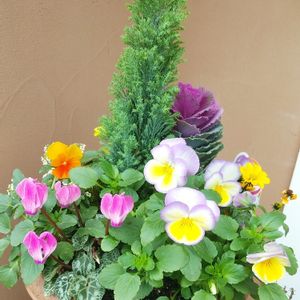 可愛い寄せ植💜 ビオラ🌼ガーデンシクラメン🌼 葉ボタン🌿🌿 クレストウィルマ🌿🌿 よく行くカフェ☕の入り口でお迎えしています🎵💕