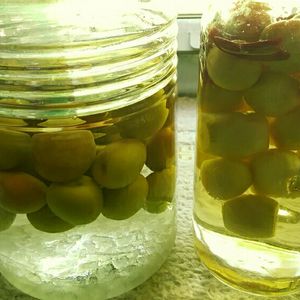 ヤマモモ酒つくりました。 三ヶ月くらいで飲めます♪ 瓶一個に詰め込みすぎなので氷砂糖が溶けたら二個に分けてレモンの皮を足します。