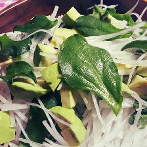 頂き物の夏大根と庭先に植えてるアイスプラントと冷蔵庫にあったアボカドでサラダ♪ ドレッシングは自家製の柚子ドレッシングでいただきました。 今日はめっちゃ忙しかったので写真一枚にて失礼します(笑) 今日もお疲れさまでしたー。