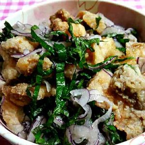 豚バラブロック素揚げと赤玉ねぎスライスと大葉たっぷりを塩コショウ少々で和えたやつ! 毎度ながら盛り付け適当♪ お好みでポン酢かゴマだれでいただきます。