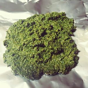 収穫したバジルでバジルソースをつくったよ。 松の実ないのでアーモンドで代用しました。 とりあえず今日はポークソテーにつけていただきます✨
