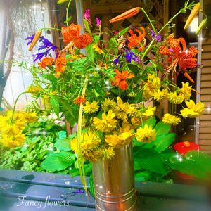 大雨☔️だったのもあり、久々に目についたものドバッと沢山挿しました〜 チョイ派手目編✨✨ 鬼百合 メドーセージ 八重花笠菊 野鶏頭? 秋の田村草 マリーゴールド 追記 ルドベキア タカオ 八重花笠菊とマリーゴールドは実は10日位お外で挿してたもの、長持ち〜❣️