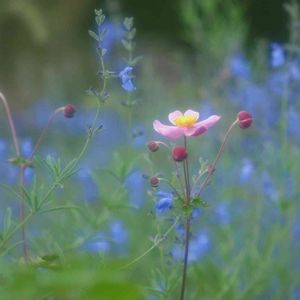 秋明菊 ブルーのサルビアに囲まれて 昨日撮影です